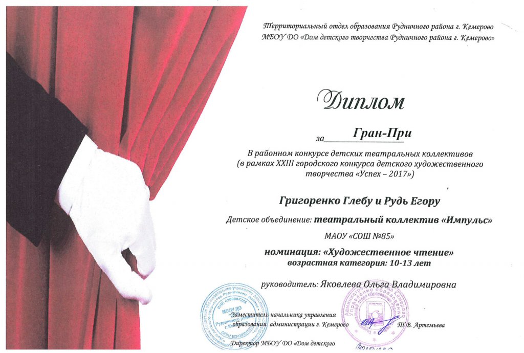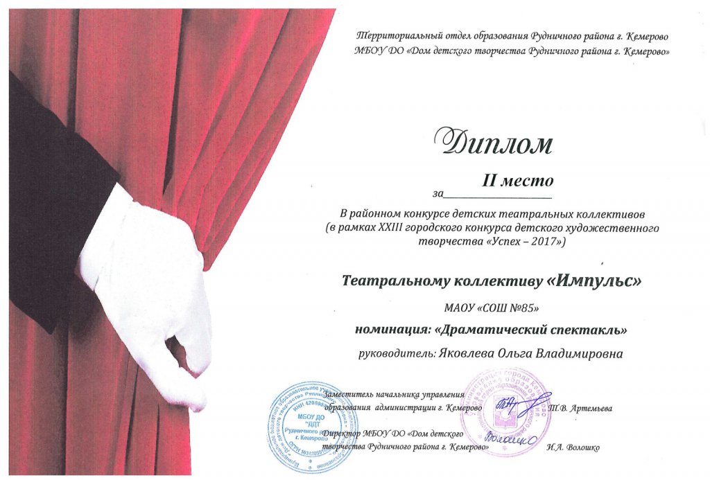 Дружба помогла нашим ребятам завоевать любовь и признание зрителей. Жюри высоко оценило актерское мастерство участников театральной студии «Импульс» и профессионализм её руководителя Ольги Владимировны Яковлевой.