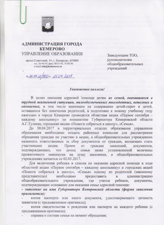 Читать далее письмо Администрации г. Кемерово Управление образования №04-04-12/1732 от 25.04.2017 лист 1, лист 2, форма заявления.