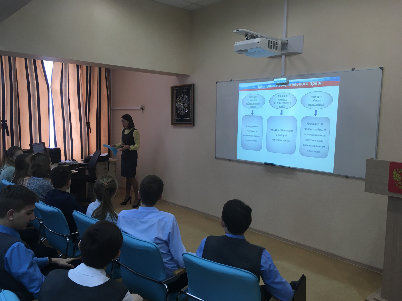 21 февраля в нашей школе прошёл правовой урок, организованный территориальным управлением ж.р. "Лесная Поляна". Учащиеся узнали об избирательном праве, его принципах, разобрали понятия избиратель и кандидат. Также обсудили, какие обязанности у наблюдателя на выборах и многое другое. Урок проводила Виктория Валерьевна Овчинникова, заведующая отделом организационной и массовой работы с населением.