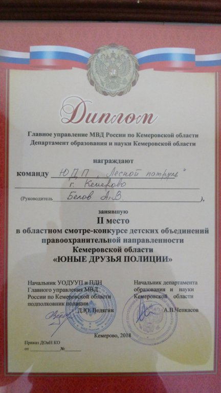 С 31 октября по 5 ноября 2018 года на базе ГАУДО Кемеровской области «Детский оздоровительно-образовательный (профильный) центр «Сибирская сказка» (Новокузнецкий район, с. Костенково) проходил 9-ый областной смотр - конкурс детских объединений правоохранительной направленности Кемеровской области «ЮНЫЕ ДРУЗЬЯ ПОЛИЦИИ». В смотре участвовали победители муниципальных этапов, лучшие отряды из 31 территории Кемеровской области. Город Кемерово на этом смотре представлял победитель городского конкурса 2017 года отряд ЮДП «Лесной патруль» из МАОУ «СОШ № 85». На протяжении всей смены команды показывали свои способности в таких конкурсах как: