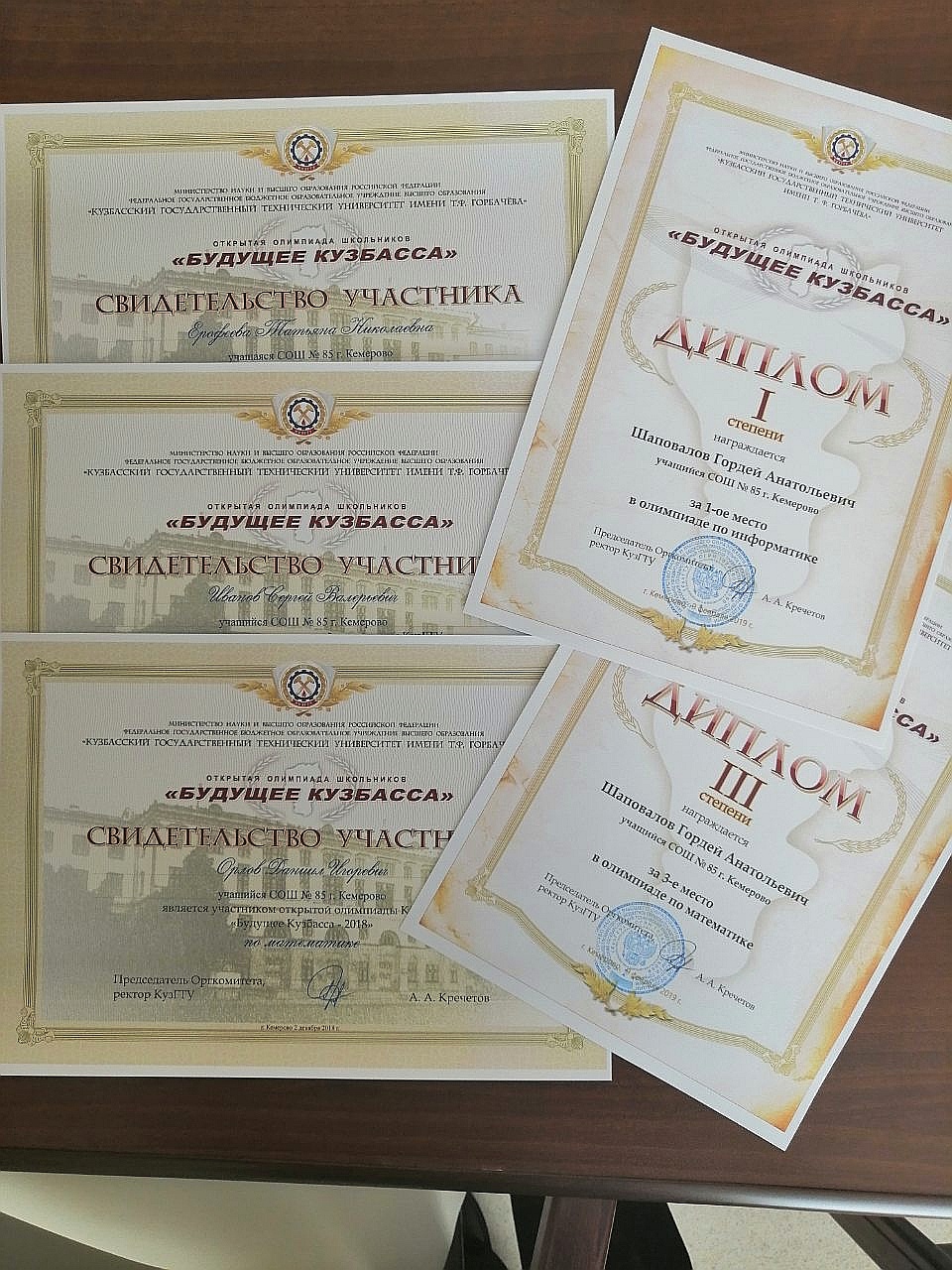 В КузГТУ 16 февраля состоялась церемония вручения дипломов победителями и призёрами Открытой олимпиады школьников "Будущее Кузбасса". Шаповалову Гордею, ученику 11А, вручили Диплом I степени за 1-е место в олимпиаде по информатике (учитель Мисютина Е. П.), Диплом III степени за 3-место в олимпиаде по математике (учитель Ступаренко С. В.). Учащиеся Орлов Даниил, Ерофеева Татьяна, ученики 10А класса, и Иванов Сергей, ученик 11Б, получили свидетельство участников олимпиады.