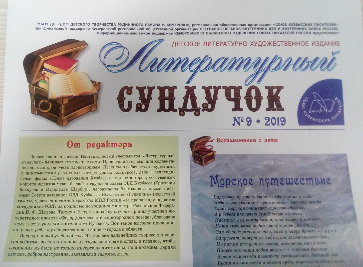 23 октября в областной библиотеке имени В.Д. Федорова прошла презентация девятого номера газеты «Литературный сундучок». «Литературный сундучок» - это газета, которая призвана объединить юных авторов (сочинителей и художников) всего города, начиная с дошкольного возраста и до 17 лет. Цель газеты – стать стимулом, мотивацией для литературного и изобразительного творчества детей и их самовыражения, «сундучком», «копилкой» детских литературных проб. В девятом номере газеты опубликовано стихотворение юной писательницы, ученицы 5Е класса МАОУ «СОШ №85» Коноваловой Анны «Бездомный щенок». Анна стала стипендиатом фонта «Юные дарования Кузбасса».