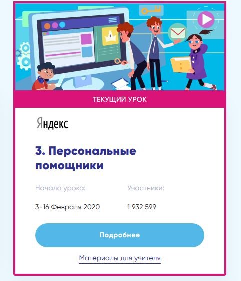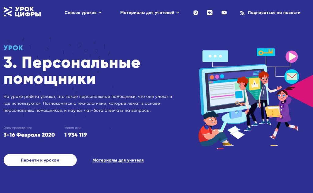 Новый урок «Персональные помощники» проводится с 3 – 16 февраля 2020 года. Выполняя задания в онлайн-тренажёре, школьники в игровой форме познакомятся с персональными помощниками, их функциями и взаимодействием с устройствами в умном доме. Ученики узнают, как устроены персональные помощники, какие технологии лежат в их основе и на каких устройствах они могут «жить». Также они научат чат-бота отвечать на запросы так, как этого ожидают пользователи. А ещё узнают, из каких этапов состоит работа голосового помощника. После прохождения всех онлайн испытаний каждый участник получит Сертификат об участие во всероссийской образовательной акции «Урок Цифры».