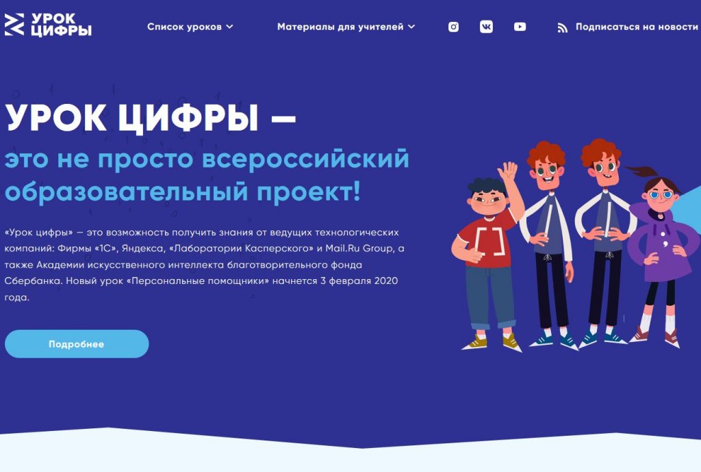 «Урок цифры» — всероссийская образовательная акция, в рамках которой школьники с 1 по 11 класс смогут в игровой форме познакомиться с основами программирования и погрузиться в увлекательный мир цифровых технологий. Это возможность получить знания от ведущих технологических компаний: Фирмы «1С», Яндекса, «Лаборатории Касперского» и Mail.Ru Group, а также Академии искусственного интеллекта благотворительного фонда Сбербанка.