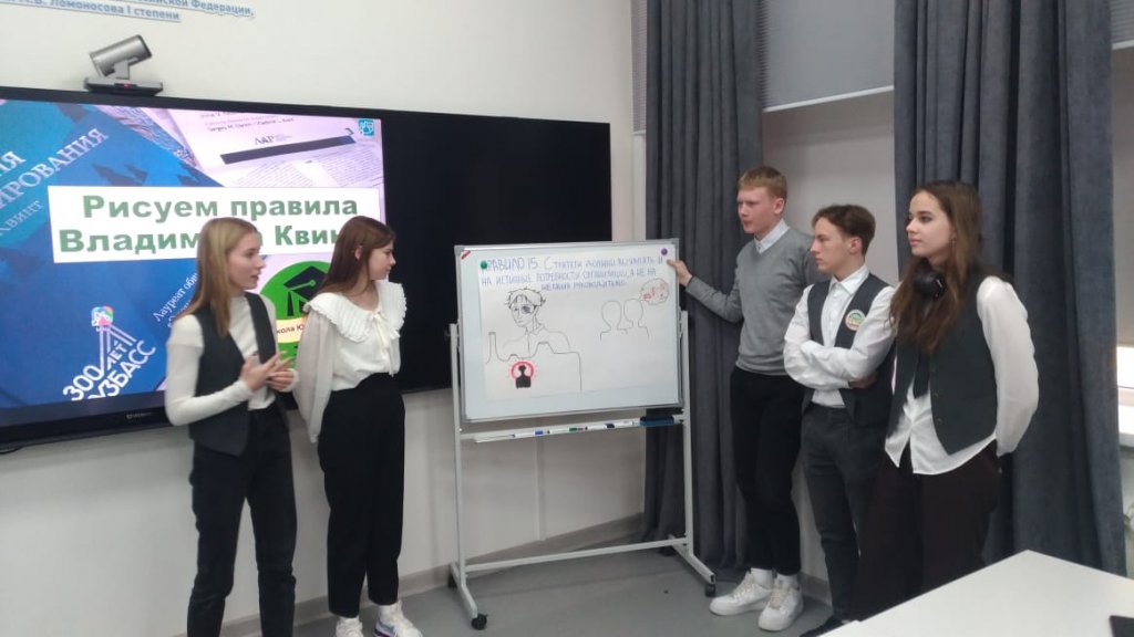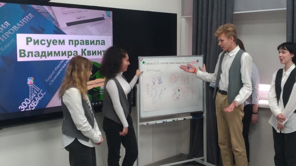 На конкурс "Сделано в Кузбассе", была представлена не только документация, но и практический процесс работы "Школы Юных стратегов Владимира Квинта", члены комиссии смогли оценить выступление Ивана Голова, учащегося 11А класса с докладом "Школа юных стратегов Владимира Квинта - от создания к развитию", мастер-класс Т.А.Бельчик, куратора из КемГУ, кандидата экономических наук, доцента кафедры менеджмента имени И.П. Поварича, а так же традиционное мероприятие "Рисуем правила Владимира Квинта".